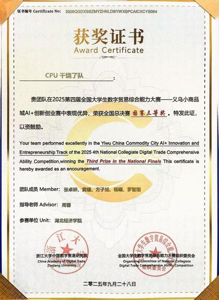 2025年10月24日,第四届尼奥尼全国大学生数字贸易综合技能大赛“义乌中国小商品城AI+创新创业赛”在浙江义乌举行,我院“CPU干烧了队”荣获...