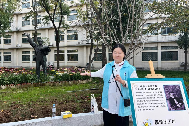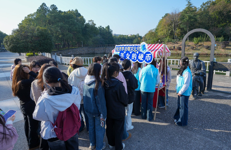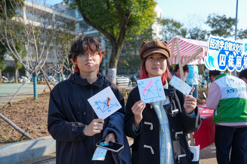 活动现场气氛热烈、人流如织。十大游园站点沿经济学家雕塑长廊依次排开,将课堂延伸至户外,构建起一座“学中做、做中悟”的开放式经济学实践园地。在“投资体验”区,同学们模拟真实市场环境,在资源配置与风险权衡中亲身体验经济规律,将课堂所“知”有效转化为实践所“行”。其他互动项目同样精彩纷呈,师生们在轻松愉悦的氛围中,深刻体悟“经世启智”的精神内涵。在游园会现场,“经研博闻”宣讲团成员站在一位位经济学家雕塑旁,成为一道靓丽的风景线,他们生动讲述经济学家的学术观点与生平故事,将凝固的雕塑化为生动的课堂,帮助同学们感受经济学家的思想智慧。