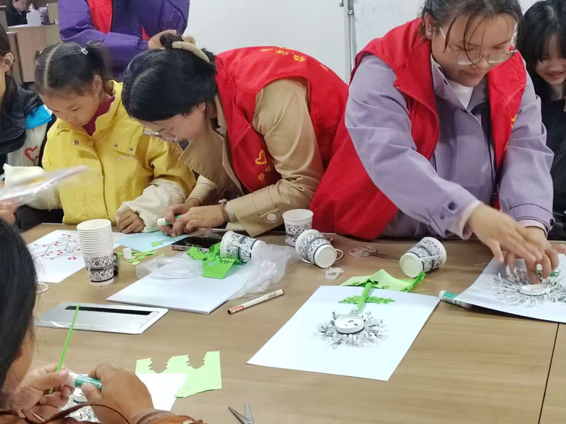 手工环节将活动推向高潮。在志愿者细致的指导下,孩子们动手制作“创意粘土插花”与“茱萸图案”。揉捏、拼接、点缀……一双双小手认真地将粘土变成一朵朵小花;在另一区域,孩子们发挥想象力,将一次性水杯改造为充满童趣的“茱萸花朵”,并在上面绘制表情,寄托对长辈健康长寿的美好祝愿。孩子们神情专注,笑语盈盈,创作热情洋溢整个活动室。
