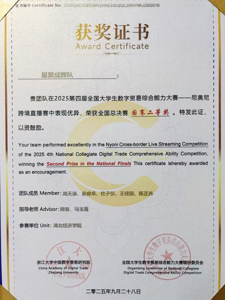 2025年9月28日,第四届尼奥尼全国大学生数字贸易综合技能大赛跨境直播赛道全国总决赛颁奖典礼在浙江大学紫金港校区举行,我院“星聚成辉队...
